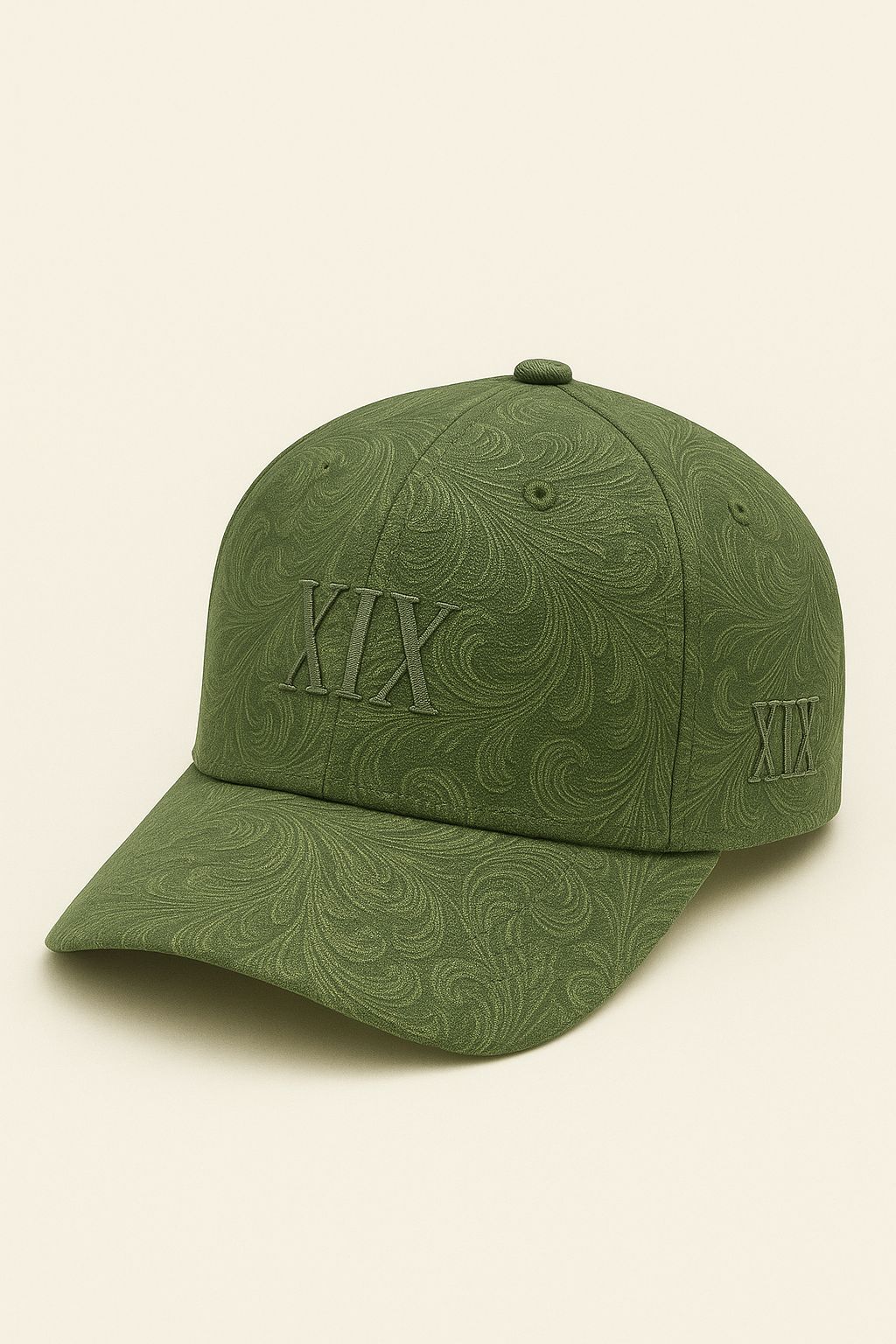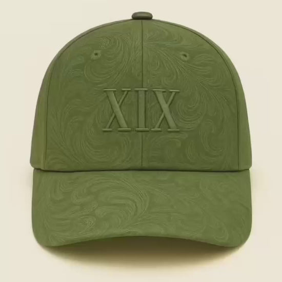 Baseball cap featuring a seasonal 3D lurex embroidered XIX logo on the centre front panel, XIX logo on the left side and Undeviginti logo on the back. Crafted from washed organic cotton and detailed with seasonal artwork print.